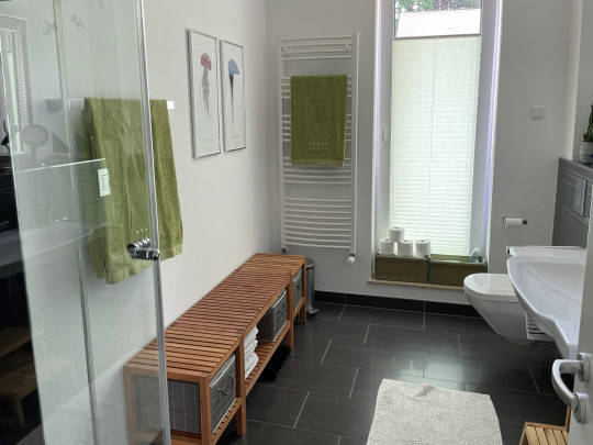 Zentrum und Highlight ist der hohe offene Wohn-/Essbereich (ca. 60 m²) mit Kamin, Licht und Atmosphäre. Der Übergang zur Küche ist offen gestaltet. Es stehen drei Schlafräume zur Verfügung, ein Bad und ein Gäste-WC mit Dusche. Im Souterrain ist der Home-Office-Bereich mit zwei Büros und Platz für Fitness.